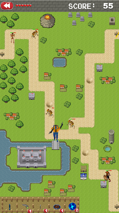 你可以使用各种武器——手枪、机枪、地雷、激光。每次击退攻击后,你都可以升级你的技能和武器。