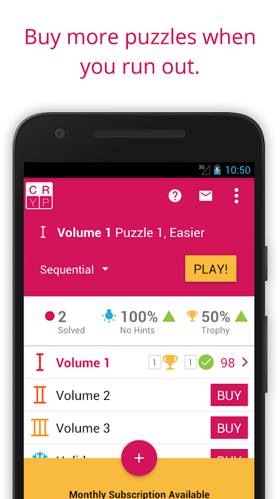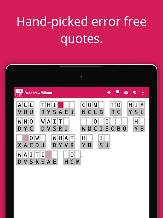 嚴重密文/ cryptoquip求解最好的應用程序。從頭開始快速質量發揮設計,該密應用程序允許你集中精力解決了這個難題。該報價是手工策劃並仔細驗證是免費的錯誤。其結果是純粹的解謎的樂趣,沒有錯別字,廣告或分心!