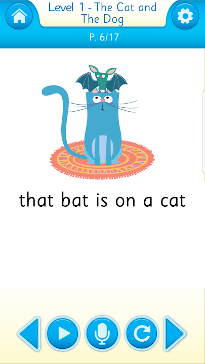 The first three books on every shelf are read-to-me stories. The stories are read aloud while the child follows along. The fourth book allows the child to practise reading, using the vocabulary from the stories just read. The record feature allows the child to record him or herself reading the story and play it back.
