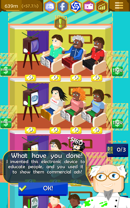 與所有現代“閒置工廠”克隆不同,除非您按下清楚標記為“在觀看廣告後獲得獎勵”的按鈕,否則此遊戲不會向您顯示任何廣告。因此,如果您不選擇觀看廣告,則該遊戲將完全免費為您提供,所有內容仍可解鎖。