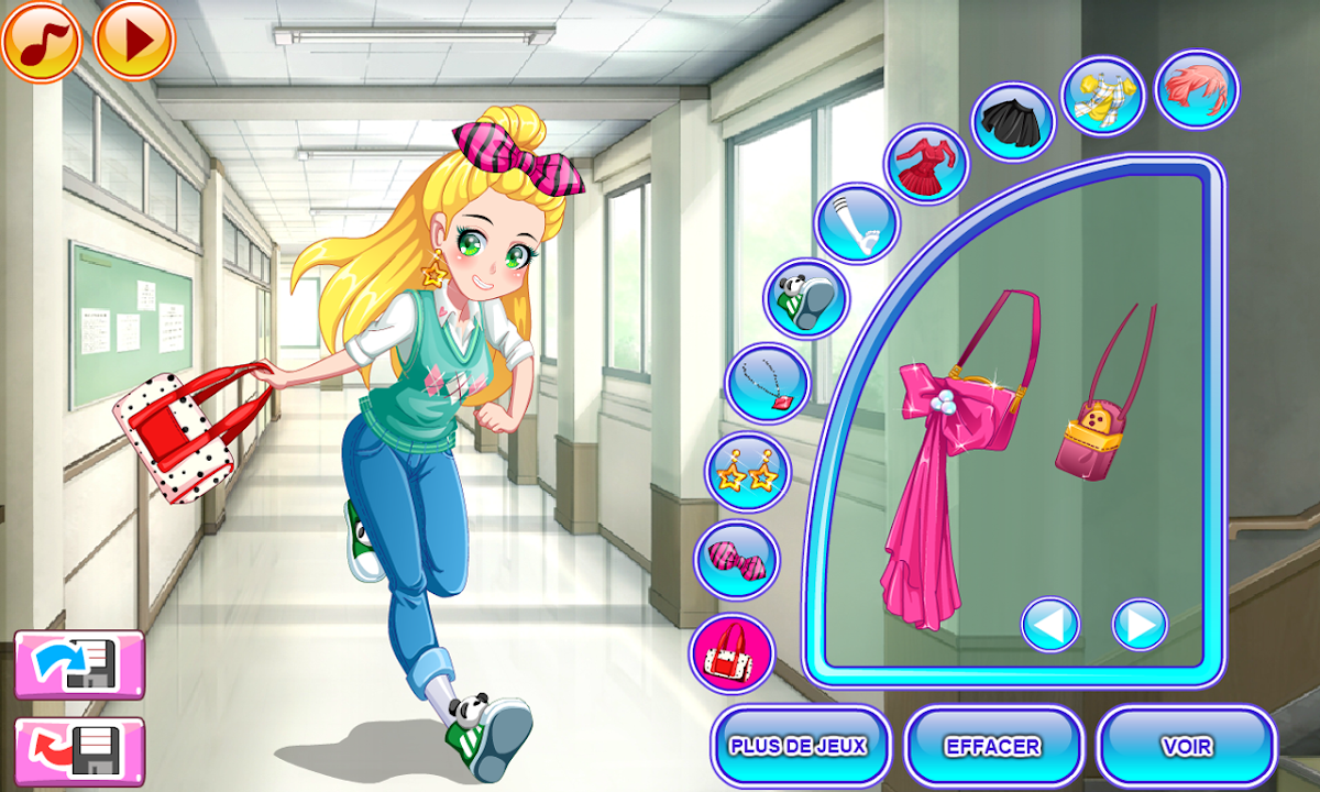 Have you ever been late for class and didn't have time to choose the perfect outfit to show off to all your friends? Well with the Late For Class makeover game you can be stylish when late for class! Here you can choose between 7 different category icons to change her hair, shirt, pants, dress, socks, shoes, necklace, earrings, hair accessories, and handbag! By clicking on each one and toggling through the options, you can create the perfect outfit that will definitely impress when you walk into that class room! Release your inner fashion designer and create the perfect outfit when late for class in this fun makeover game.