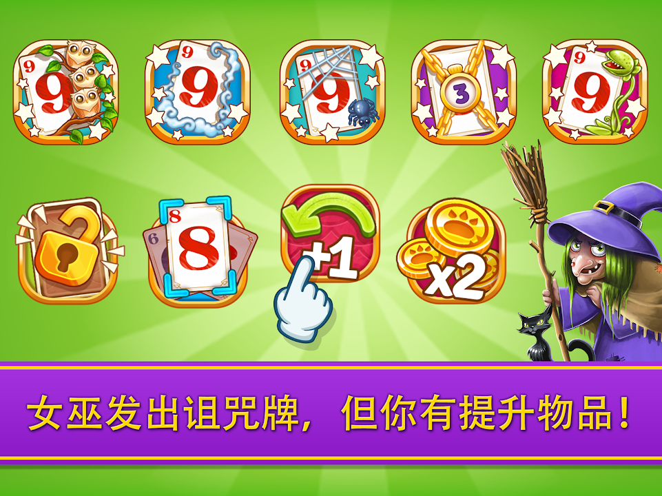 通过各种难度的关卡和地图,按数字顺序将牌消去,以获得所有的女巫卡,打败邪恶的女巫,继续你的旅程!