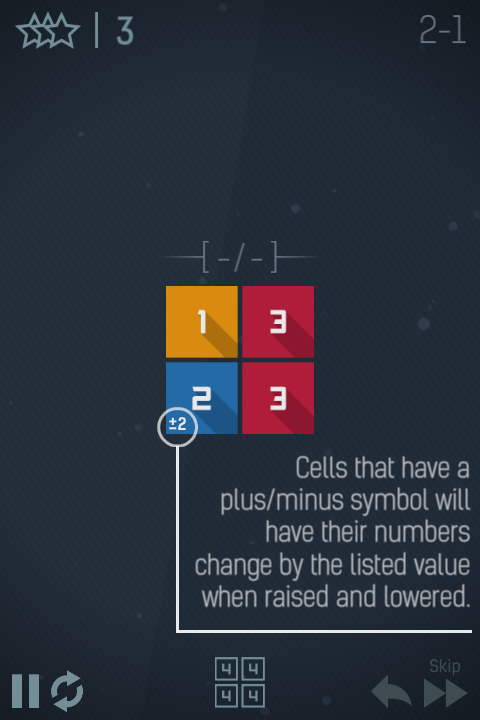 Select adjacent cells with the same number and scroll them left and right to change their values. Complete levels by creating the target pattern. Finish in as few moves as possible to get all of the stars. You will find over 50 levels.
