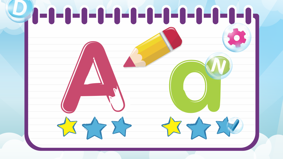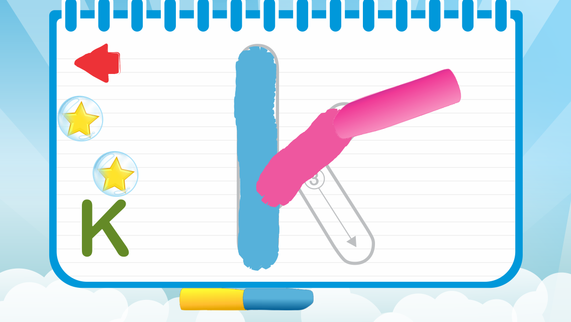– Writing the ABC letters in the paper with different colors where you are rewarded with 3 stars if you write the letter correctly, and in case of mistake you can use the eraser.