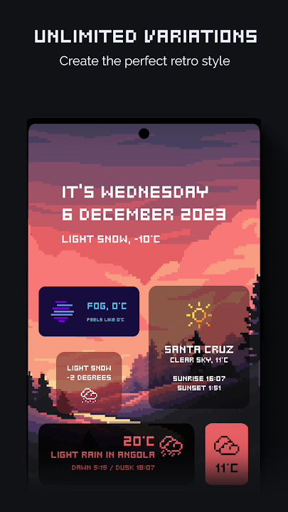 Configure aesthetic weather widgets for your home screen with minimalistic pixel art icon themes and readymade layouts. Personalise the look with a wide range of text placeholders for date, weather conditions and custom text.