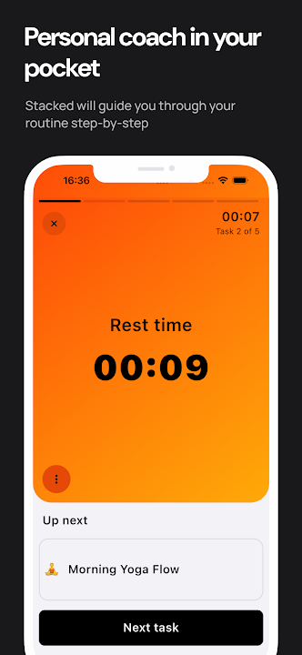 • Start your routine with a single tap. Let Stacked guide you through each step with clear instructions and timed tasks to keep you on schedule.
