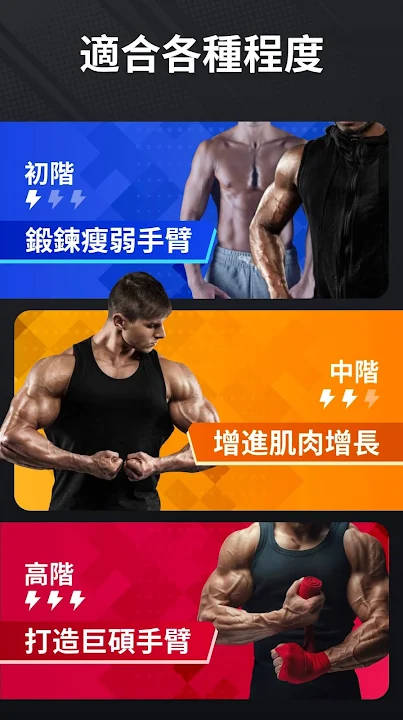 共有 3 種等級的健身計畫,幫助您一步一步練出漂亮的臂肌。無論是初學者或專家,都能找到適合您的鍛鍊運動。每天都為您準備了不同的運動,保持新鮮感與趣味。