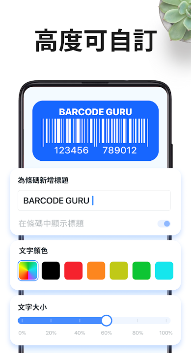 使用條碼產生器 - 條碼掃描器、條碼讀取器,您可以透過變更顏色、調整高度、新增文字和使用範本來自訂條碼。透過簡單的條碼創建步驟,您可以為自己製作獨特的條碼並吸引更多的條碼掃描器。