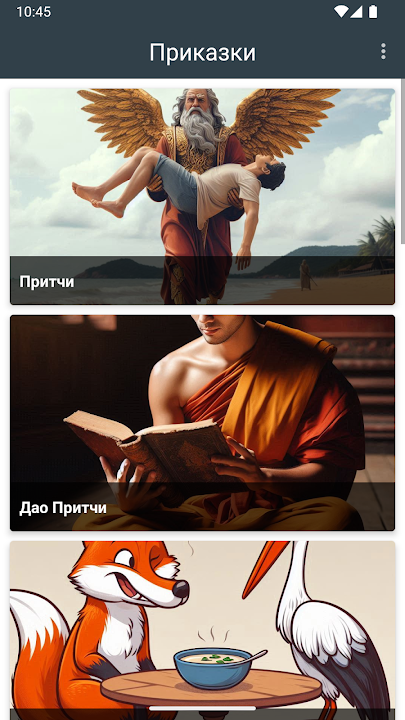 Това е сборка от поучителни разкази, притчи и басни на български език. Съдържа невероятни истории, които ще ви накарат да се замислите за живота си и да получите ценни съвети. Всички записи са офлайн и приложението няма нужда от интернет за да четете притчите. Интернет позволението е само с цел показване на реклами и споделяне на притчите. Имате контрол над размера на шрифта, тъмна тема за по-неизморително четене, както и възможност за отбелязване на прочетените истории (добавена е обща статистика за всичко прочетено). Сборката за сега съдържа 140 притчи, разделени в 2 категории, над 400 басни разделени в 2 категории, 60 забавни и интересни истории с Хитър Петър, разкази за Бай Ганьо и над 200 български народни приказки, над 200 Габровски шеги и още много други.