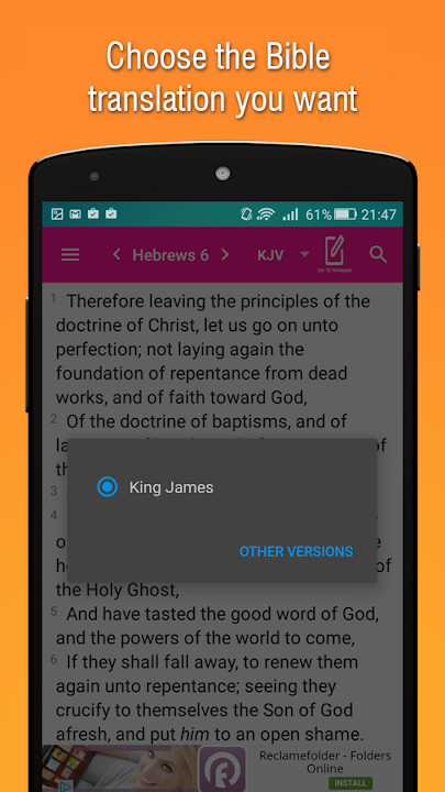 在这本圣经离线应用,有超过30多个不同的圣经版本。所有这些都可以下载到您的手机,之后可以离线使用。这意味着下载免费的圣经应用程序后,可以完全脱机使用。
