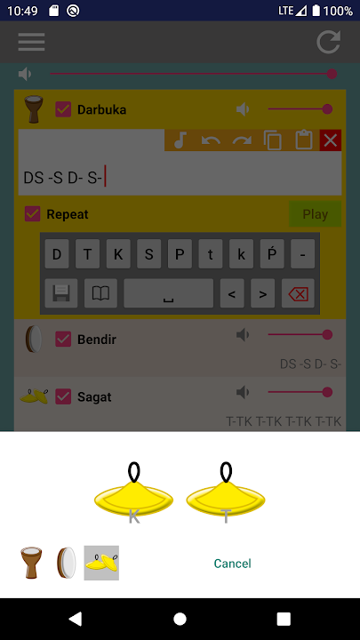 该应用程序不仅可以播放选定的传统节奏,有助于聆听和练习,而且还具有“Robo”功能,允许用户编写自己的 Darbuka 乐句或节奏。 Robo 功能使用基于 Darbuka 笔画名称的简化和直观的书写音乐系统。