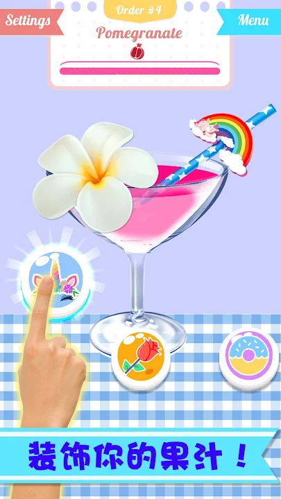 -按照游戏中的手势提示、箭头提示、图标提示等等去一步一步制作果汁。