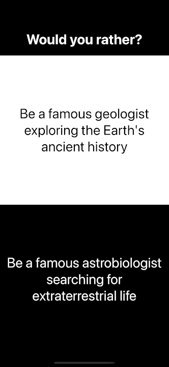 “你宁愿”是一款趣味十足的游戏,让你做出各种有趣、棘手甚至古怪的决定!如有任何疑问,欢迎随时联系我们的客服,告诉我们您的想法!