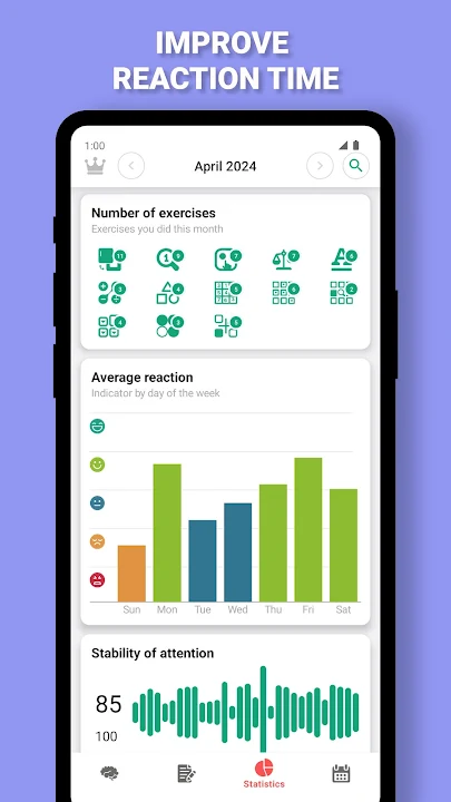 On the main screen you are offered a set of exercises, select an exercise and its description will open. Click the strat button and begin the exercise. The program will ask you to perform a series of two approaches, this is done to more accurately assess your cognitive abilities and reduce the error in the calculations. After completing the exercise, the app will evaluate your result and show your progress on the statistics tab.