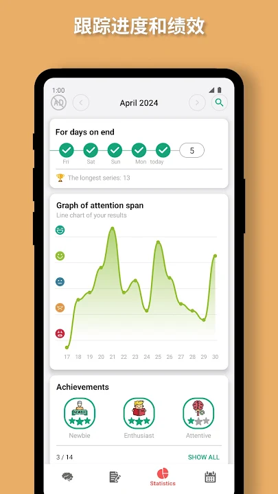在主屏幕上,您将看到一组练习,选择一个练习,就会打开其说明。点击 "开始 "按钮并开始练习。程序会要求您执行一系列两种方法,这样做是为了更准确地评估您的认知能力,减少计算误差。完成练习后,程序将评估您的结果,并在统计选项卡上显示您的进度。