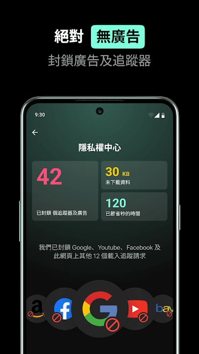 🛡️ 完整追蹤器保護:阻擋追蹤 Cookie、趁著載入前遠離網路追蹤器,並可避免第三方公司侵犯您的隱私。