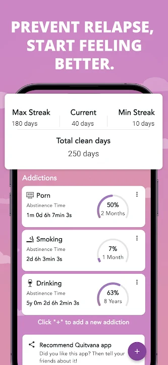 Quitvana is an addiction recovery app that helps you track self-harm behavior, stay sober, prevent relapse, quit smoking, drugs, vaping, stop drinking alcohol, fap, porn, and any other addictions so you can form better habits and live an addiction free life forever.