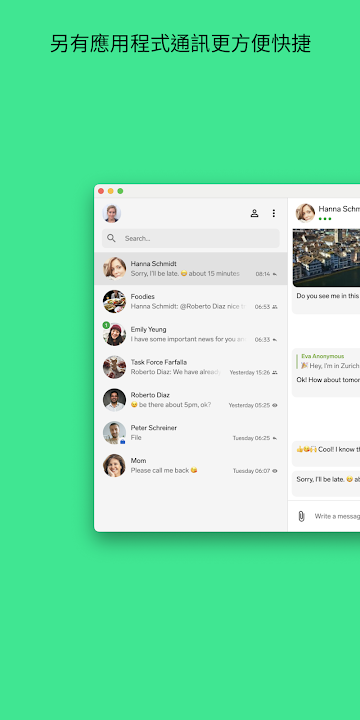 • 提供桌面應用程式與網頁用戶端,方便使用者透過電腦聊天