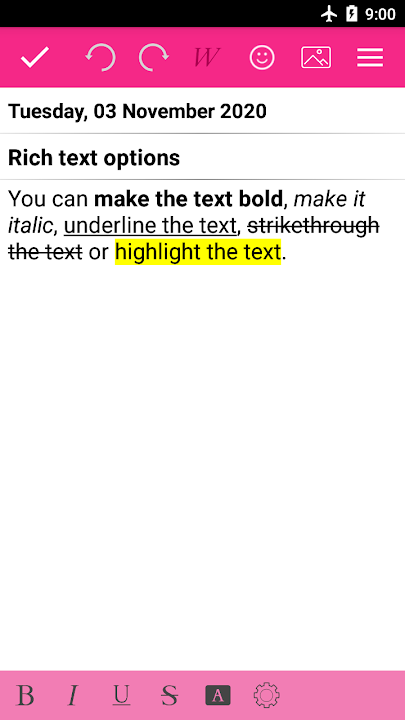 * Rich text styles : bold, italic, underline, strikethrough and highlight options.