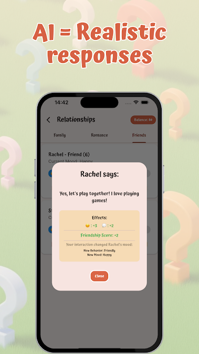 • AI 支援的互動:與我們的 AI 聊天機器人和 AI 朋友互動,建立關係,尋找女朋友/男友,甚至根據您的選擇結婚。