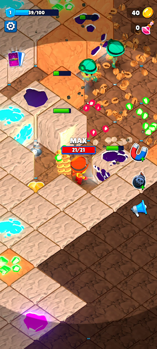 Stuck under a pile of rocks? Use bombs to blast your way out or magnets to quickly gather scattered loot!