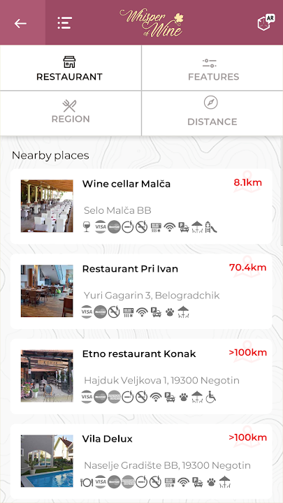 使用 Wi/Fi 下載後,Whisper of Wine AR 應用程序可以離線工作。該數字解決方案正在解決一些缺點,從而改善旅行者對該 CBC 地區和巴爾幹遺產的實時體驗(例如城市、史前遺址、考古遺址、堡壘、自然保護區、高等教育工業遺產、村莊、釀酒廠、美食、非物質遺產)。