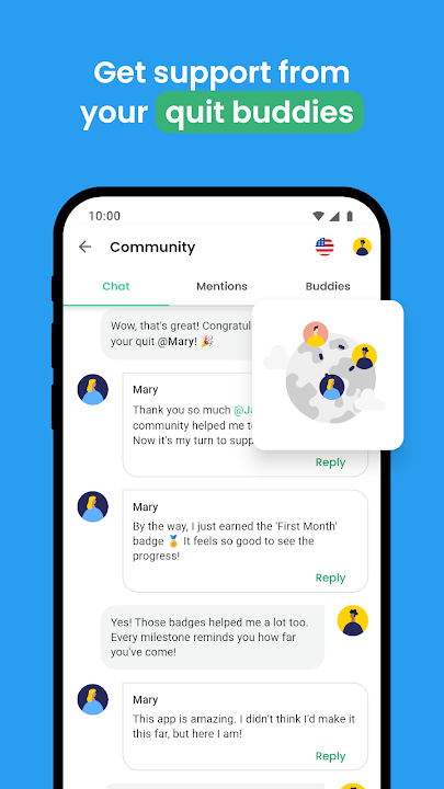 💬 Community: the ex-smokers' chat: When you quit smoking, it’s important to stay in non-smoking environments. QuitNow provides a chat filled with people who, like you, have bid farewell to tobacco. Surrounding yourself with non-smokers will make your journey smoother.