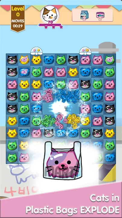 - 匹配3个或更多相同的猫咪牌,即可将其从棋盘上清除。