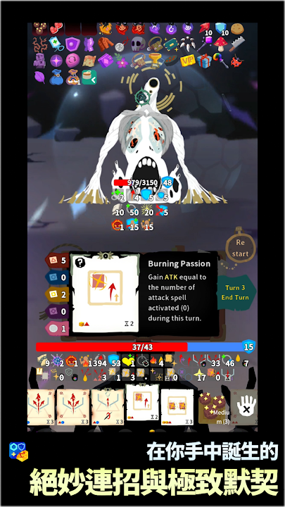 - 收集合適的法陣和遺物,打造屬於你的牌組,打倒越來越強的怪物。