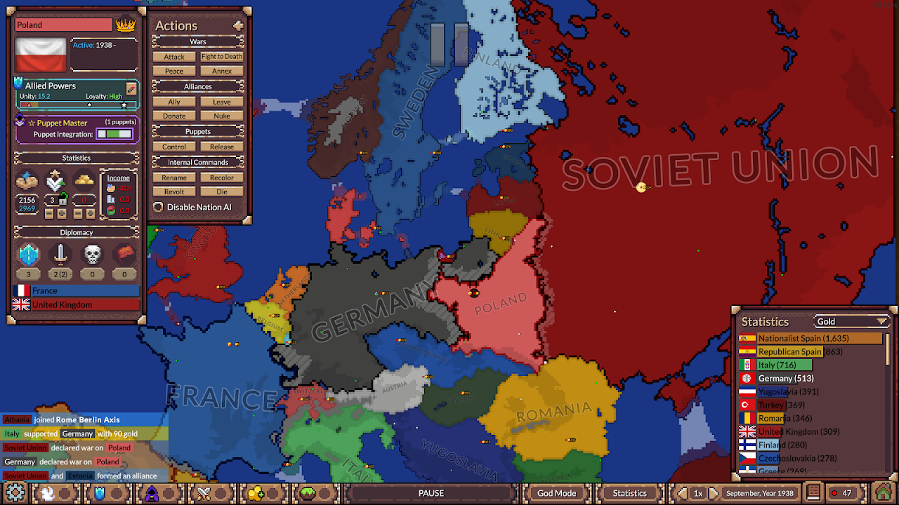 In this game you observe customized AI nations battle it out to ultimately try to control the world in a massive free-for-all, featuring alliances, revolts, puppet states and all kinds of political twists!