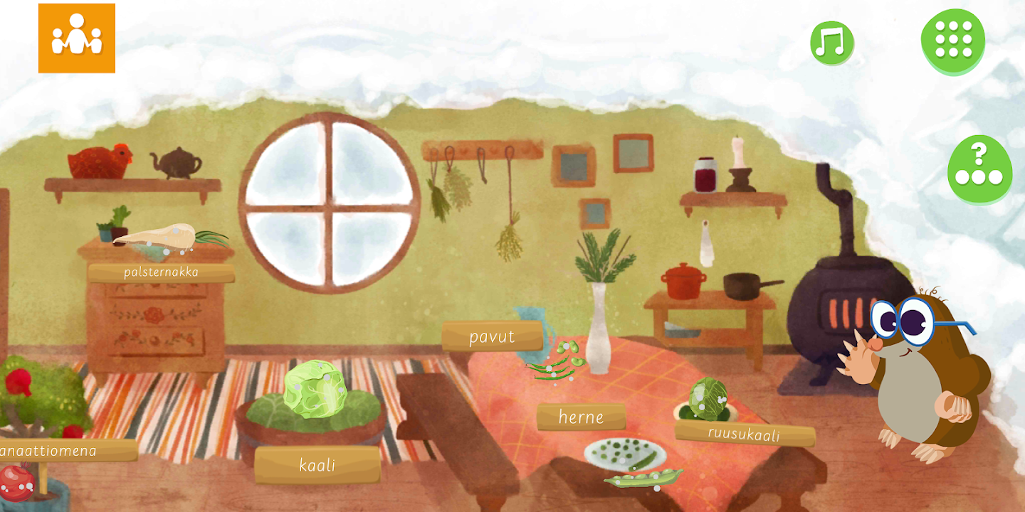 该应用程序分为四个季节,每个季节分为三个不同的部分:成人引导的蔬菜,素食品尝(品尝银行)和鼹鼠世界中的免费迷你游戏。根据收获季节,所选择的蔬菜分为季节。每个季节都包括在鼹鼠世界中发现的六种植物。按下蔬菜图像打开一个成人导向的学习部分,讨论蔬菜,通过各种任务和游戏探索其属性。