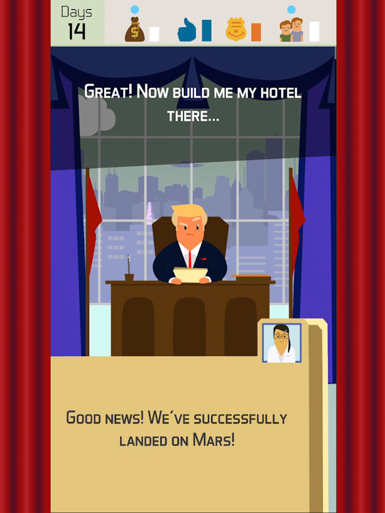 I Am President will test your wits to see if you are fit to become a leader of the country. How long can you stay in power before you are overthrown by the people. Even if the people love you, can you avoid some “accidents” that will cut short your presidency reign?