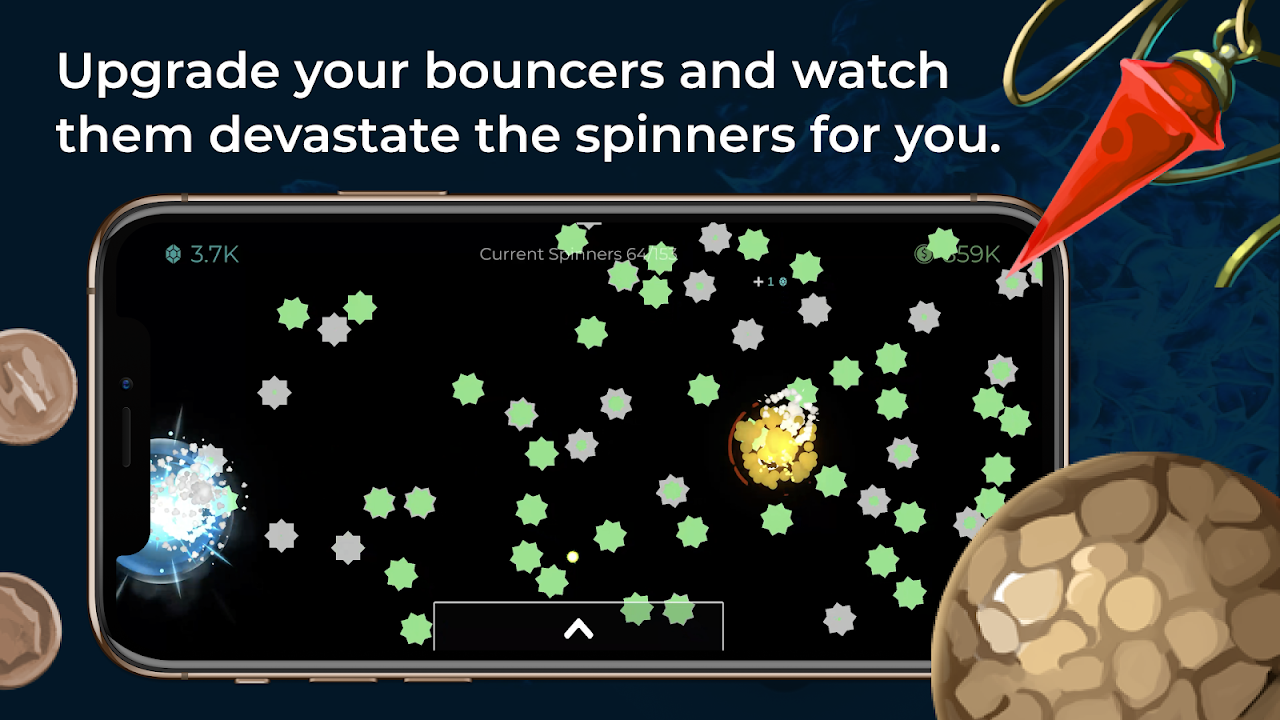 Use your gems to buy upgrades and unlock special bouncers to destroy the spinners.