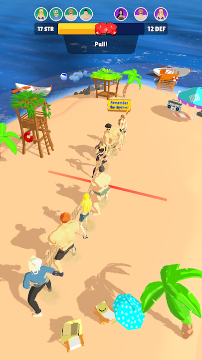 Tug of war game with a deck building features. Select and train your team. Place teammates onto the rope, fight against players. The goal is to pull the opponent's team through the finish line.