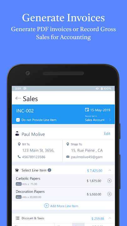 INPUT TAXES : The app supports tracking input credits for VAT / GST etc. on your purchases and offsetting the same on taxes payable against your Sales.