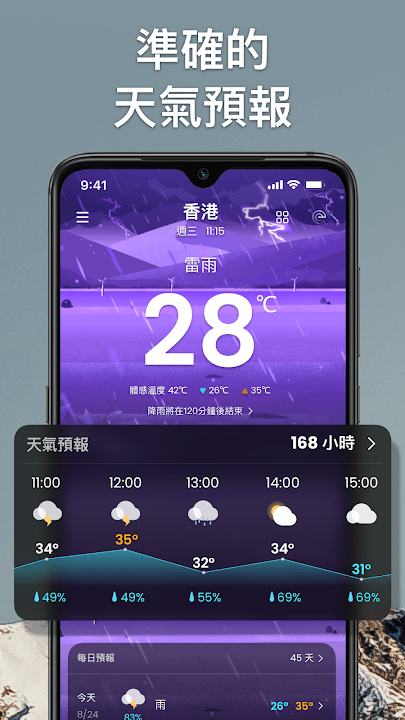 天氣預報 - 實時天氣和雷達和小工具無論您身在何處,都能立即為您提供準確的天氣信息。您會看到天氣每小時更新。你可以仔細準備您的計劃,它將幫助您更舒適地工作和生活。天氣預報是您的最佳選擇之一。