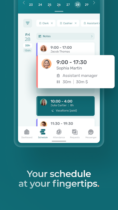 • Manage time off and replacement requests in seconds