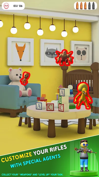 遊戲在不同的關卡中展開,每個關卡都被設計成一個獨特的房間,裡面裝滿了日常物品和隱藏點。從舒適的客廳和熱鬧的廚房到神秘的閣樓和充滿活力的遊戲室,每個環境都經過精心設計,提供令人愉悅的視覺體驗。你的任務是仔細掃描這些房間,使用狙擊步槍的瞄準鏡來定位潛伏在意想不到的地方的小怪物。