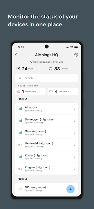 The Airthings Business app is for professional users of the Airthings for Business indoor air quality monitoring solution. It simplifies the installation and management of large-scale deployments of Space devices in offices, schools and public buildings.