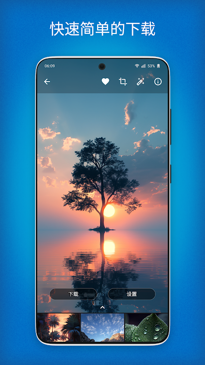 为手机下载图片从未如此简单。应用程序界面尽可能方便-下载墙纸,只需单击一个按钮。