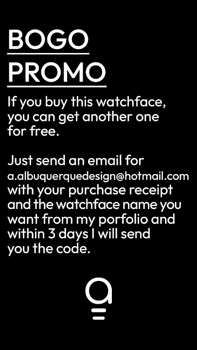 If you buy this watchface, you get other one for free, send me an email at a.albuquerquedesign@hotmail.com with your purchase receipt and the name of the watchface you want from my portfolio, within 3 days I will send a free promo code of the watchface that you want.