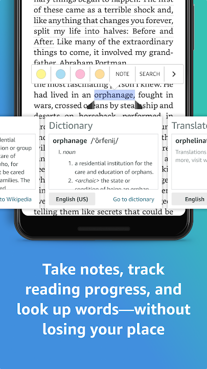 - Look up words, people, and places while you read. Breeze through words you don’t know and characters you can’t remember with the built-in dictionary, X-Ray, Wikipedia lookup, instant translations, and search within your book. Simply tap and hold a word to view its definition, or follow links to Google and Wikipedia to get more information.