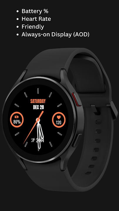 Elegant analog watch face with battery, heart rate, steps & date display.