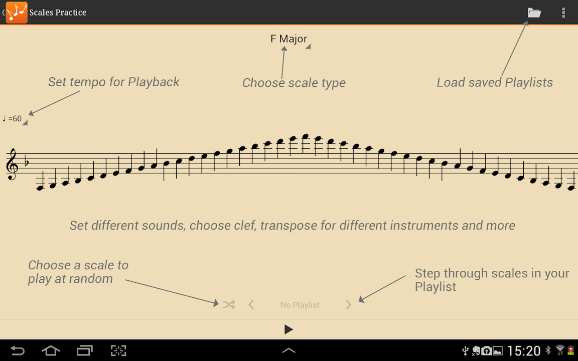 You can also save Playlists of chosen scales to play through one by one or get the app to pick a scale at random.