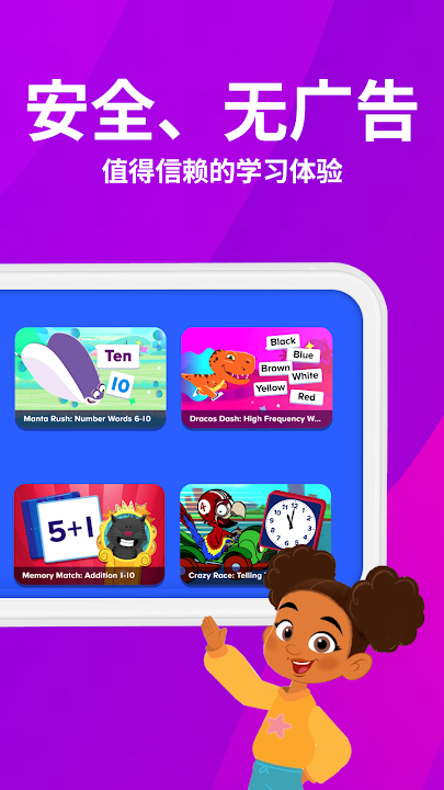 - 安全的学习环境:没有第三方广告或弹窗,获得了 kidSAFE+ COPPA 认证