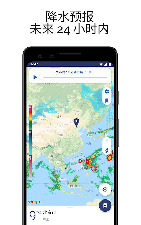 可获取全球大多数地区的降水、气温、雪深预报地图、卫星地图、以及由降水警报支持的天气预报等信息。