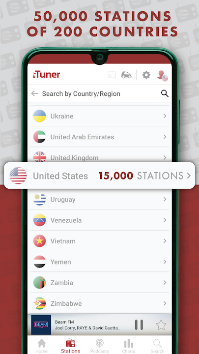 - listen to more than 50,000 Live radio stations from more than 200 countries and territories;