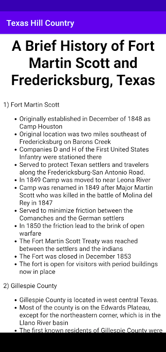 这是我们的德州一日游系列应用程序中的初始版本。这是我们对希尔国家的关注。用户可以使用它来定位和了解几个 Hill Country 城市,包括 Boerne、Fredericksburg、Mason、Menard、Junction、Lampasas、Burnet、Marble Falls 等。