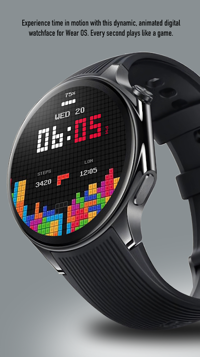 This dynamic and visually engaging watchface reimagines retro-inspired block mechanics into a lively animated timepiece. Blocks cascade from the top of the screen and settle into place, cleverly forming the digits of the current time. The animation cycles smoothly, providing a continuous sense of movement without compromising readability. With every minute update, the falling blocks reset and descend in a new configuration, keeping the display fresh and visually stimulating.