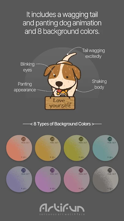 !僅支援圓形錶盤!適用於 Wear OS 的數位錶盤ㆍ顯示:日期、時間、電池百分比ㆍ8種背景顏色ㆍ狗喘氣並搖尾巴的動畫